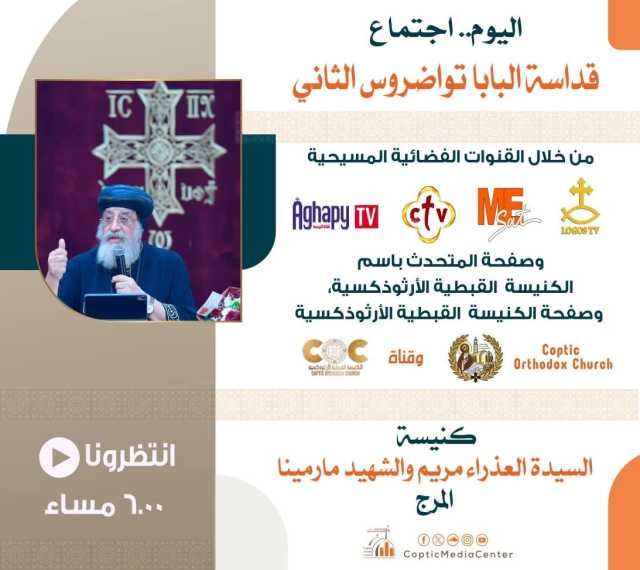 ألقى قداسة البابا تواضروس الثاني عظته الأسبوعية في اجتماع الأربعاء مساء اليوم، من كنيسة القديس الأنبا أنطونيوس بالمقر البابوي بالقاهرة، دون حضور شعبي، وبُثت العظة عبر القنوات الفضائية المسيحية وقناة C.O.C التابعة للمركز الإعلامي للكنيسة على شبكة الإنترنت.