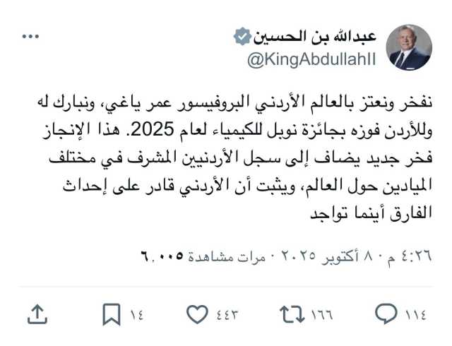 “نفخر ونعتز بالعالم الأردني البروفيسور عمر ياغي، ونبارك له وللأردن فوزه بجائزة نوبل للكيمياء لعام 2025. هذا الإنجاز فخر جديد يضاف إلى سجل الأردنيين المشرف في مختلف الميادين حول العالم، ويثبت أن الأردني قادر على إحداث الفارق أينما تواجد.”