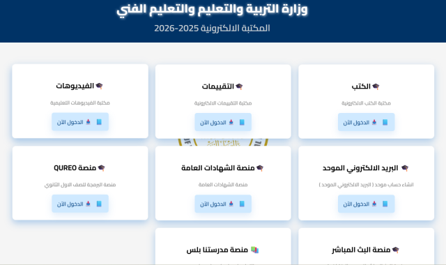 ويمكن الآن لطلاب جميع الصفوف الدراسية تحميل تقييمات وزارة التربية والتعليم من المكتبة الالكترونية 2025 - 2026 بموقع وزارة التربية والتعليم من خلال اتباع الخطوات التالية :