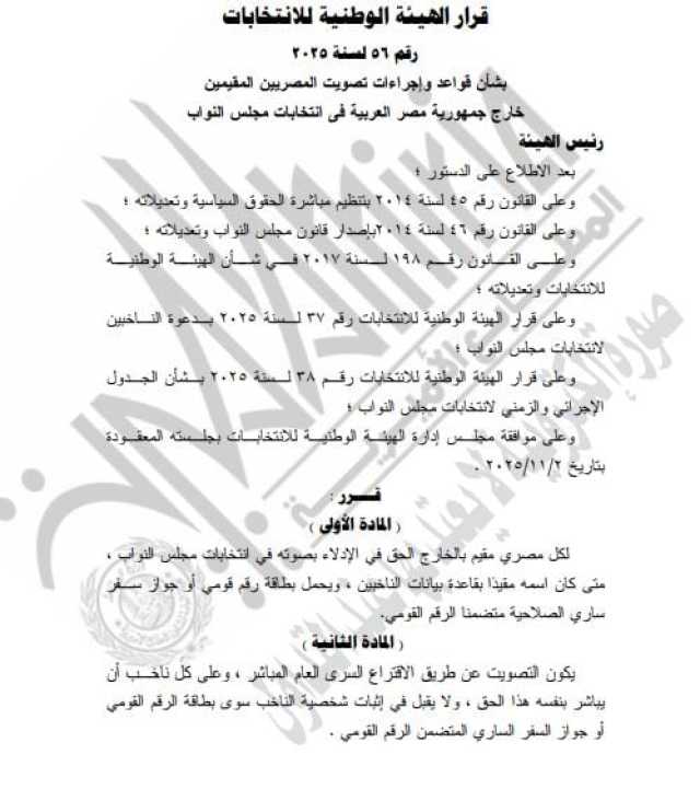 أصدرت الهيئة الوطنية للانتخابات برئاسة القاضى حازم بدوى، القرار رقم 56 لسنة 2025 بشأن قواعد وإجراءات تصويت المصريين المقيمين خارج جمهورية مصر العربية في انتخابات مجلس النواب.