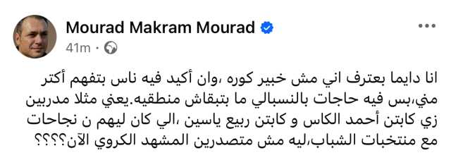 عبر الفنان مراد مكرم، عن استغرابه من غياب بعض الأسماء الكروية البارزة عن الساحة التدريبية في مصر، رغم ما حققوه من نجاحات واضحة مع منتخبات الشباب.