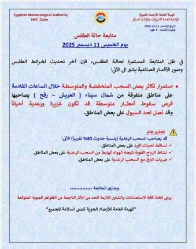اقرأ أيضاًاضطراب الأحوال الجوية.. حالة الطقس اليوم الخميس 11 ديسمبر 2025