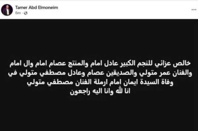 صراحة نيوز- توفيت مساء اليوم إيمان إمام، شقيقة الفنان عادل إمام، وزوجة الفنان الراحل مصطفى متولي، ووالدة الفنان عمر متولي، بعد حياة اتسمت بالهدوء والابتعاد عن الأضواء، حيث فضّلت العيش بعيدًا عن الإعلام رغم انتمائها لأسرة فنية عريقة.