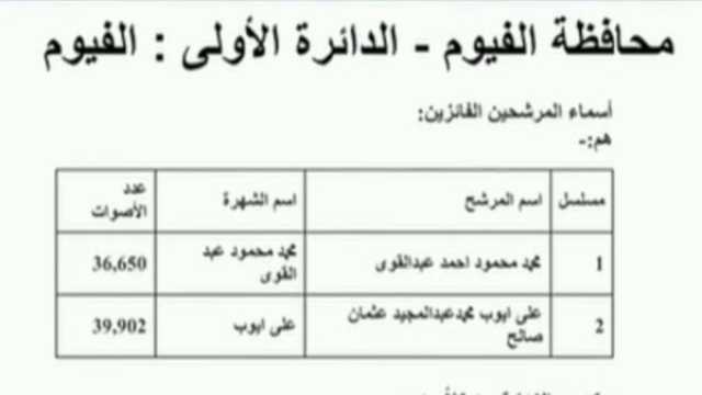 وأضاف أن المرشحان الفائزان بالدائرة الأولى بمحافظة الفيوم ومقرها مركز الفيوم، محمد محمود أحمد عبد القوي، علي أيوب محمد عبد المجيد عثمان صالح والإعادة بين المرشحين سيد أحمد سلطان يوسف ومحمد فؤاد زغلول عبد الحفيظ.