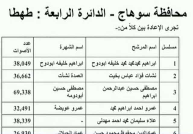 والإعادة بين 4 مرشحين بالدائرة الأولى سوهاج وهم :علاء الدين قدري – حازم ذكي – دياب محمد – علي مصطفى