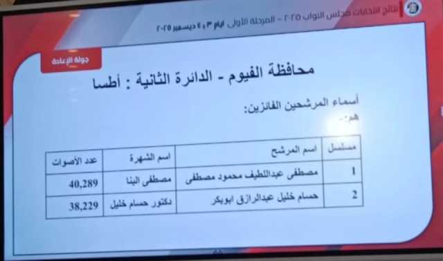 الهيئة الوطنية للانتخابات: فوز مصطفى البنا وحسام خليل بالدائرة الثانية أطسا بالفيوم