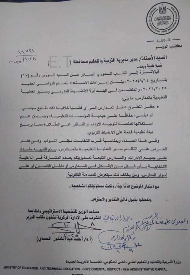 كما قررت وزارة التربية والتعليم والتعليم الفني ، حظر التطرق داخل المدارس إلى أي قضايا خلافية ذات طابع سياسي أو ديني ، حفاظا على حيادية المؤسسات التعليمية ، وضمان عدم استغلالها كمنصة لتوجيه الآراء أو التأثير على الطلاب مما يرسخ بيئة تعليمية قائمة على الانضباط التربوي .