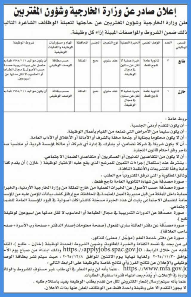 صراحة نيوز -أعلنت وزارة الخارجية وشؤون المغتربين الأحد، عن حاجتها لتعبئة وظائف شاغرة ضمن الشروط والمواصفات المبينة ازاء كل وظيفة.