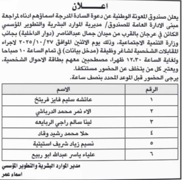 عاجل | بالأسماء.. “المعونة الوطنية” تدعو مرشحين لمقابلات وظيفية