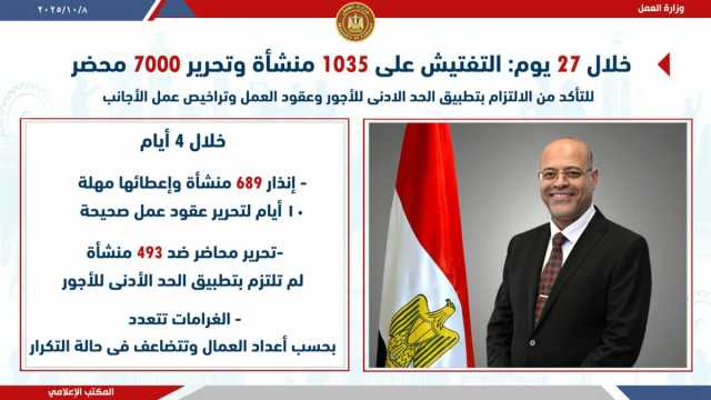 وزير العمل: 1035 منشأة خضعوا للتفتيش خلال 27 يوما لضمان تطبيق القانون