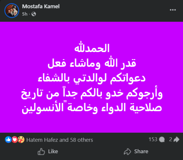 وكتب مصطفى كامل: “قدر الله وما شاء فعل دعواتكم لوالدتي بالشفاء، وأرجوكم خدوا بالكم من تاريخ صلاحية الدواء وخاصةً الإنسولين”، مشيرًا إلى تعرض والدته لوعكة صحية شديدة، فيما طالب متابعيه بالدعاء لها بالشفاء العاجل.