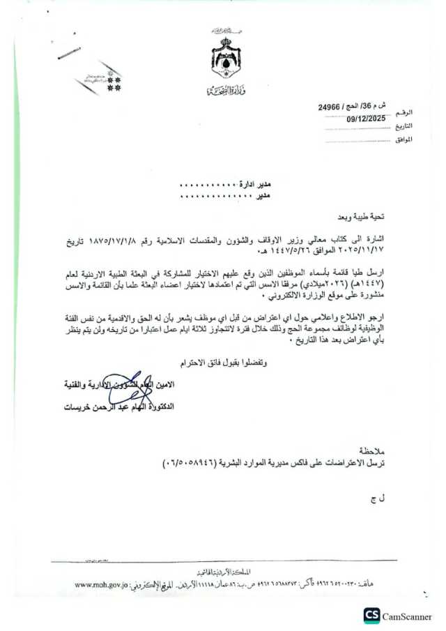 أعلنت #وزارة_الصحة اسماء #الموظفين الذين وقع عليهم الاختيار للمشاركة في #البعثة_الطبية_الاردنية للحج للعام 2026 وعددهم 39 موظفا.