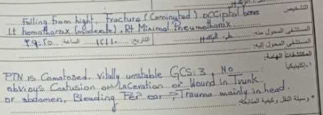 وكشف الفحص الطبي في مستشفى السلام عن إصابة الطفل بكسر متفتت في الجمجمة ونزيف بالصدر، بينما تابعت غرفة الطوارئ في هيئة الرعاية الصحية حالته بشكل مستمر، مع تجهيز كل السبل الطبية للتعامل الفوري مع أي تطورات.