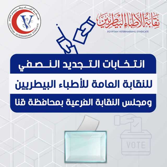 أعلنت النقابة العامة للأطباء البيطريين برئاسة الدكتور مجدى حسن النقيب العام، عن فتح باب تلقي طلبات الترشح لانتخابات التجديد النصفي للنقابة العامة ومجلس النقابة الفرعية بمحافظة قنا 2026، اعتباراً من يوم الخميس 4 ديسمبر 2025.