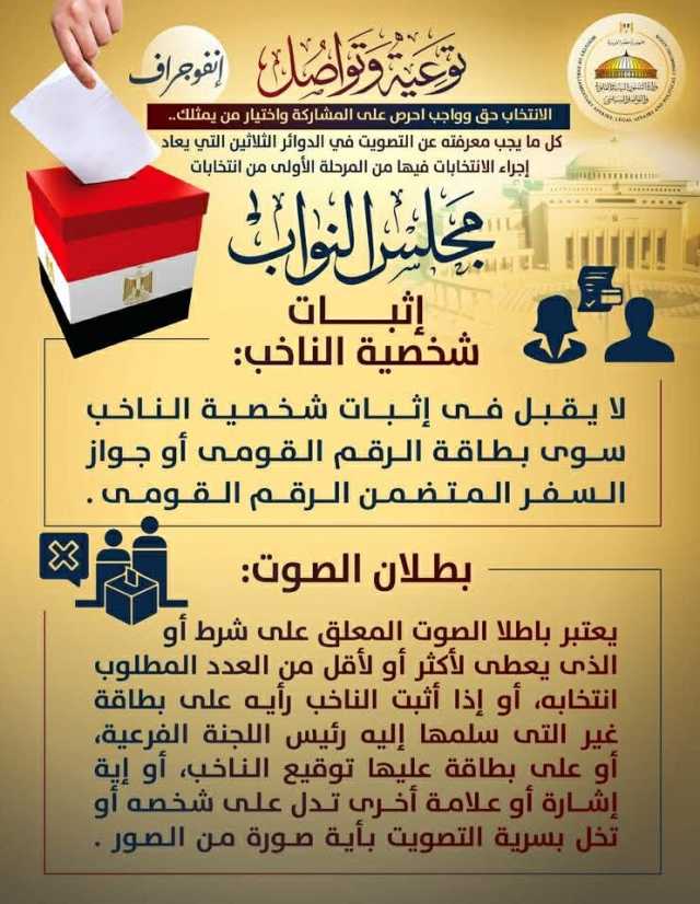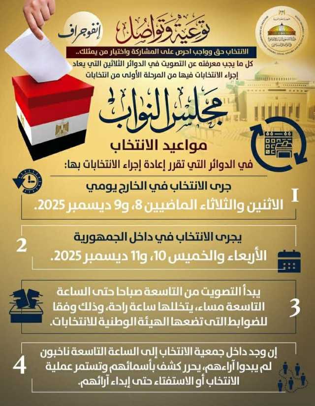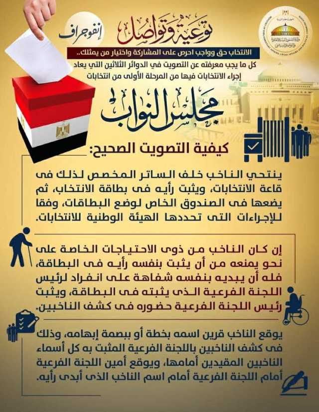 أصدرت وزارة الشؤون النيابية والقانونية والتواصل السياسي سلسلة إنفوجرافات جديدة من المحتوى التوعوي الذي تنشره الوزارة بمناسبة #انتخابات_مجلس_النواب ٢٠٢٥، بعنوان "الانتخاب حق وواجب احرص على المشاركة واختيار من يمثلك.. كل ما يجب معرفته عن التصويت في الدوائر الثلاثين التي يعاد إجراء الانتخابات فيها من المرحلة الأولى من انتخابات مجلس النواب ".