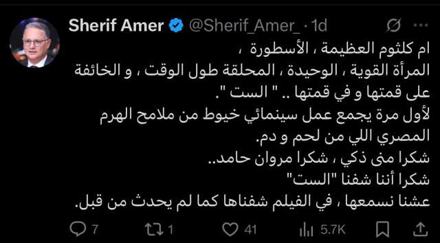 وكتب شريف عامر عبر حسابه الشخصي على منصة إكس: "ام كلثوم العظيمة، الأسطورة،المرأة القوية، الوحيدة، المحلقة طول الوقت، والخائفة على قمتها وفي قمتها".