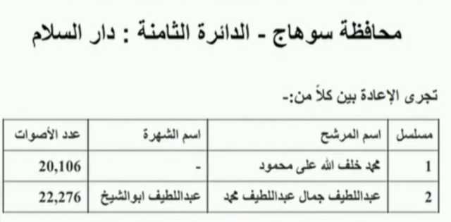 أعلن رئيس الهيئة الإعادة بين مرشحين اثنين بالدائرة الثامنة دار السلام بسوهاج وهما : محمد خلف الله – عبداللطيف جمال.