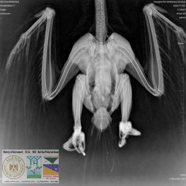وأظهرت الفحوصات عدم وجود كسور، بينما تبيّن إصابة الطائر بـ طفيليات جلدية استدعت تلقي علاجًا متخصصًا.