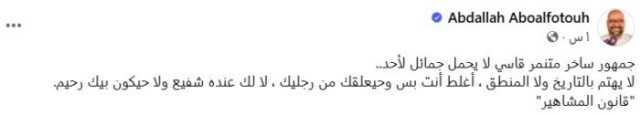 ووجه عبد الله أبو الفتوح، عبر حسابه الرسمي بموقع التواصل الاجتماعي «فيسبوك» للجمهور، قائلا: «وكتب أبو الفتوح عبر منشور له عبر حسابه على فيسبوك: جمهور ساخر متنمر قاسٍ، لا يحمل جميلا لأحد، لا يهتم بالتاريخ ولا بالمنطق، أخطئ فقط، وسيعلقك من رجليك، لا شفيع عنده ولا رحمة… هذا هو قانون المشاهير».