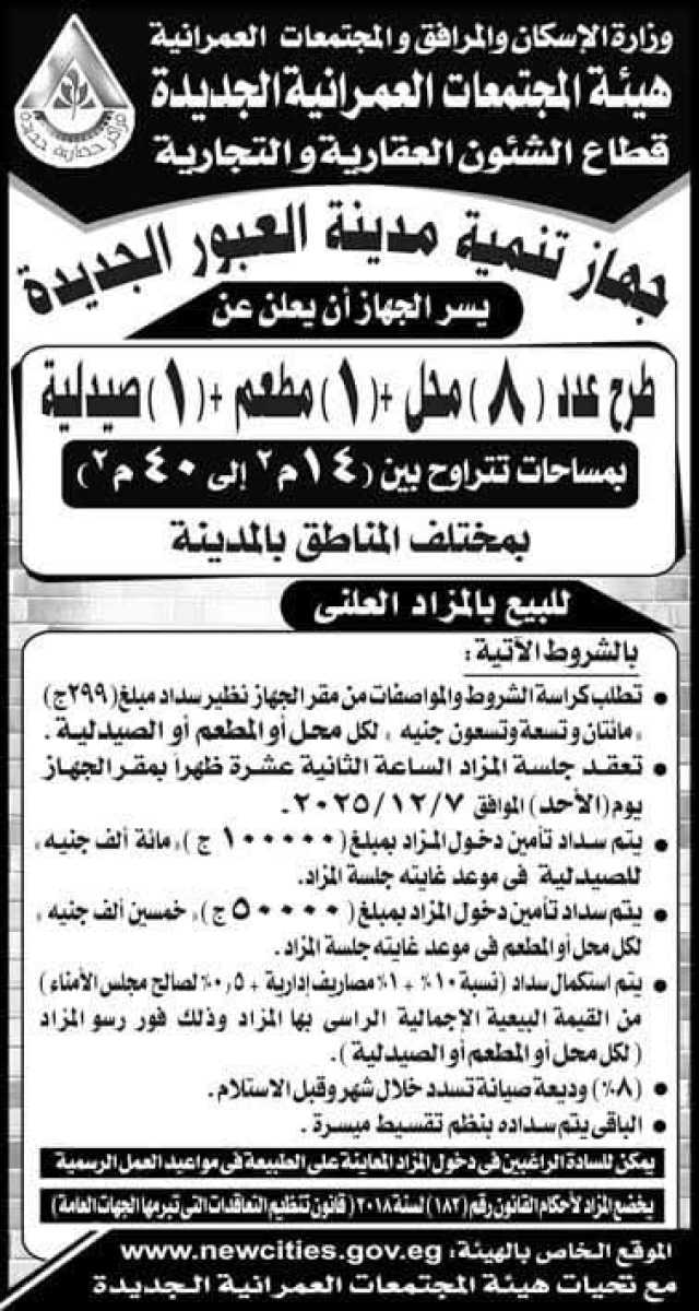 فرص استثمارية في العبور الجديدة بمزاد علني