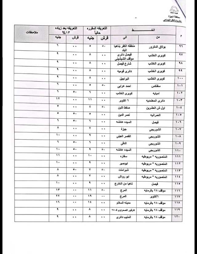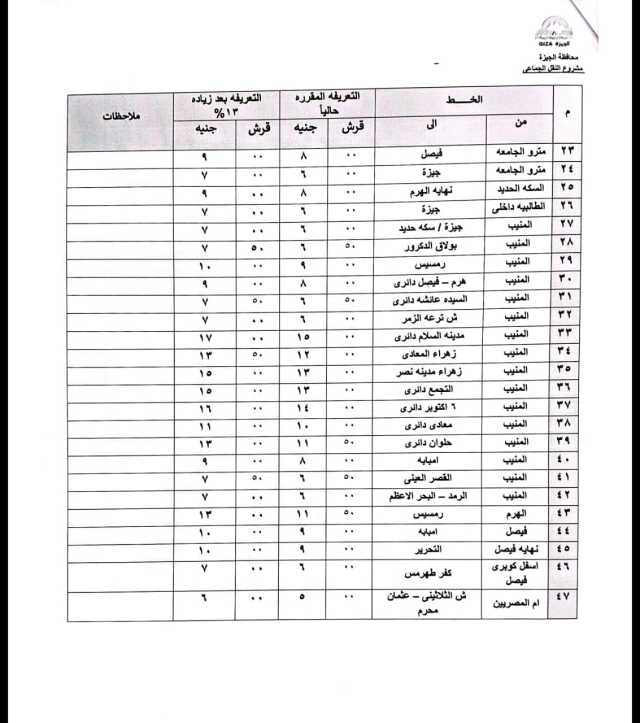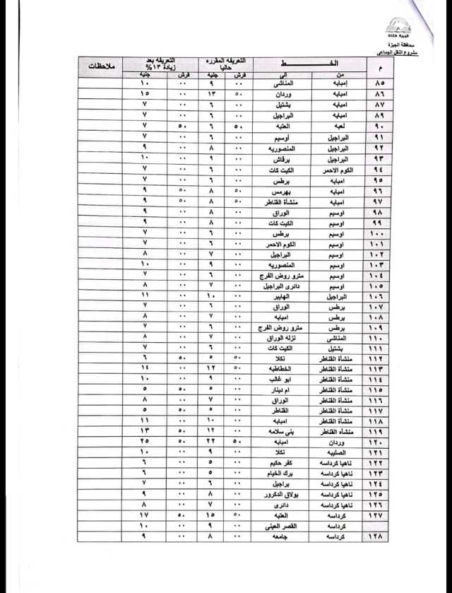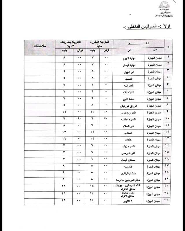 وكلف محافظ الجيزة جهاز السرفيس والأحياء والمراكز بطباعة ملصقات وبانرات بالتعريفة الجديدة والالتزام بنشرها بالمواقف وتعليقها في مكان واضح للمواطنين والسائقين.