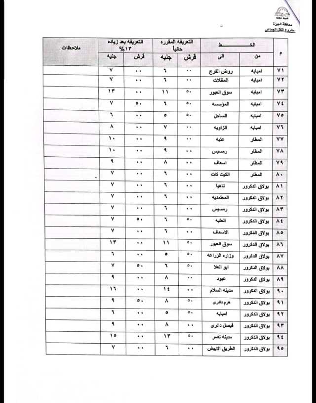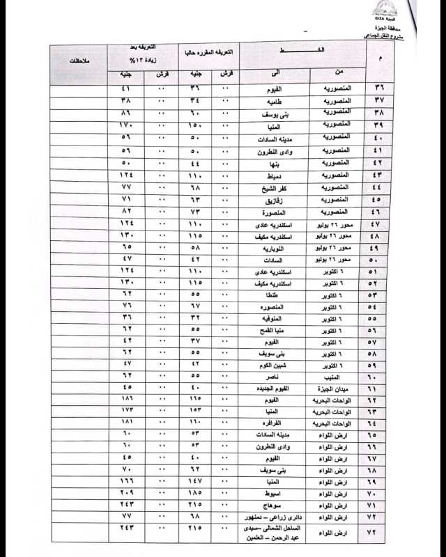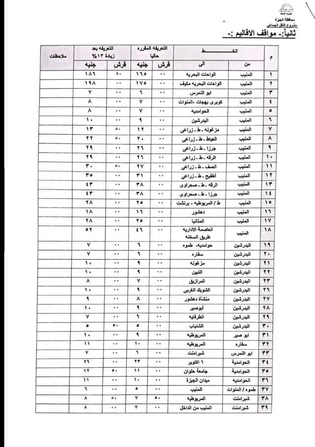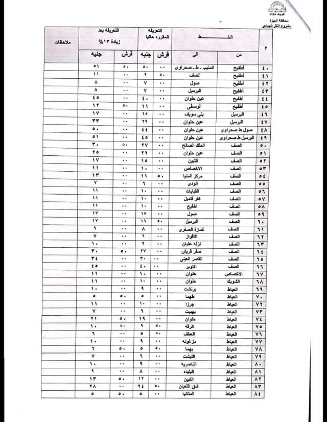 وأشار إلى أنه تم تنسيق تعريفات خطوط السير لسيارات السرفيس الخارجية (الأقاليم) مع المحافظات المجاورة وغيرها من المحافظات التي ترتبط مع محافظة الجيزة بخطوط سير لسيارات الأقاليم لضمان توحيد التعريفة.