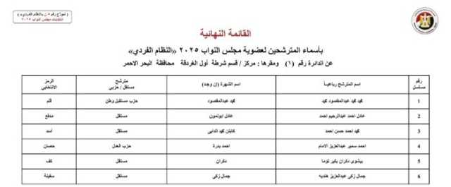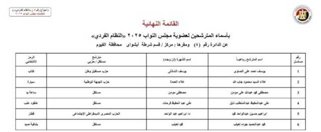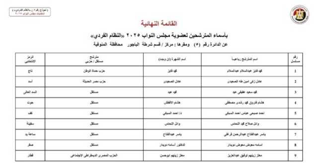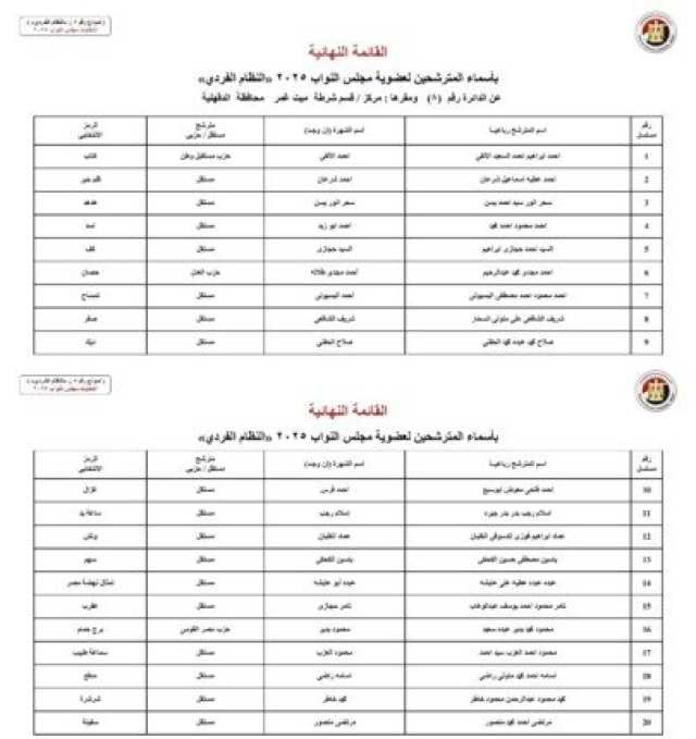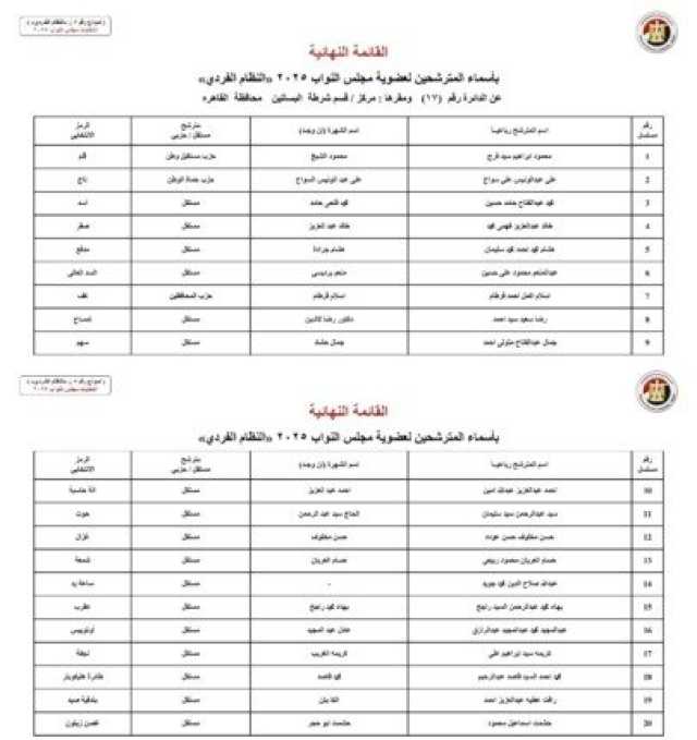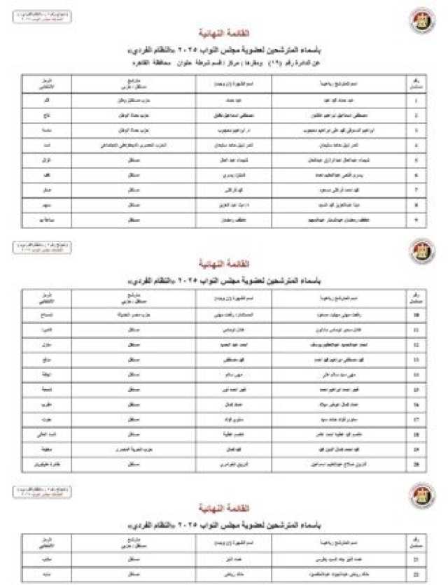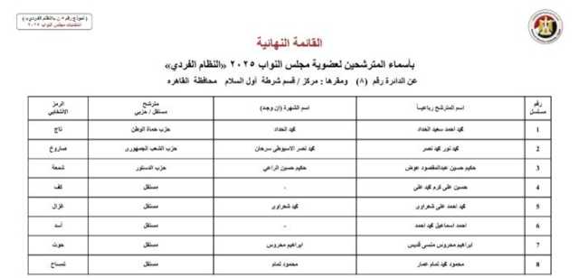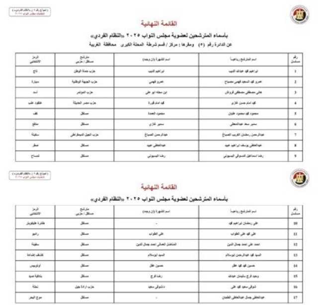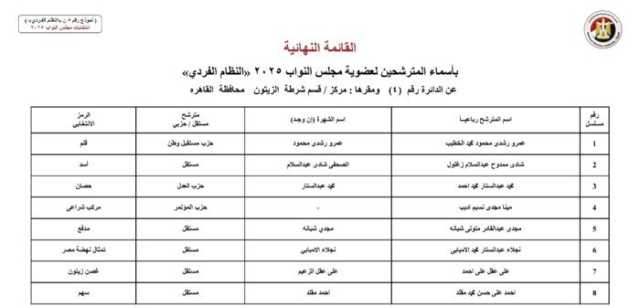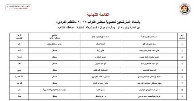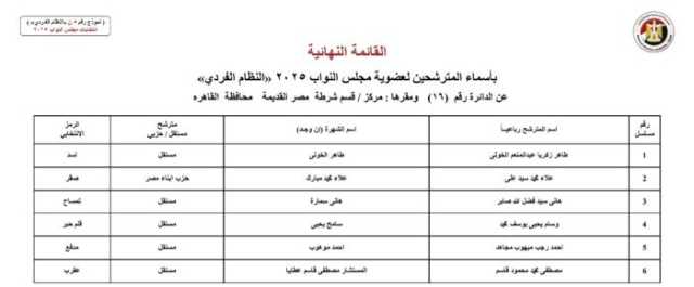 ويأتي أسماء المرشحين في انتخابات مجلس النواب 2025 عن النظام الفردي في محافظة الجيزة كالآتي: