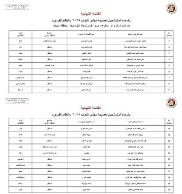 أسماء المرشحين في محافظة محافظة دمياط: