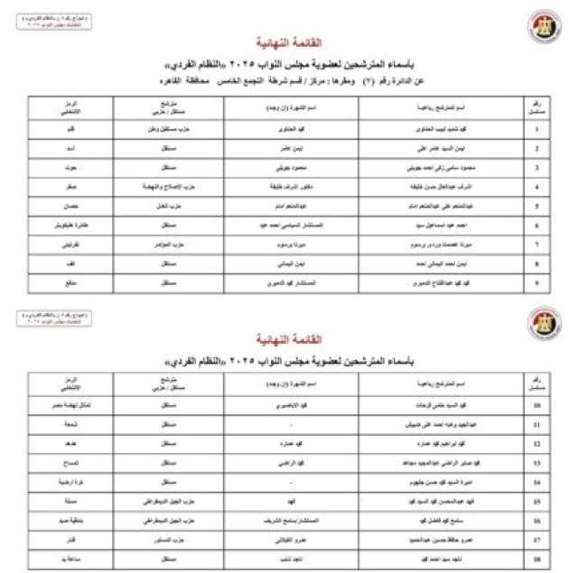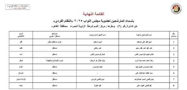 و تنشر «الأسبوع»، أسماء المرشحين في انتخابات مجلس النواب 2025 عن النظام الفردي في محافظة القاهرة عبر الصور الآتية: