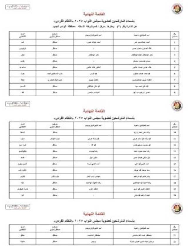 أسماء المرشحين في محافظة محافظة الوادي الجديد: