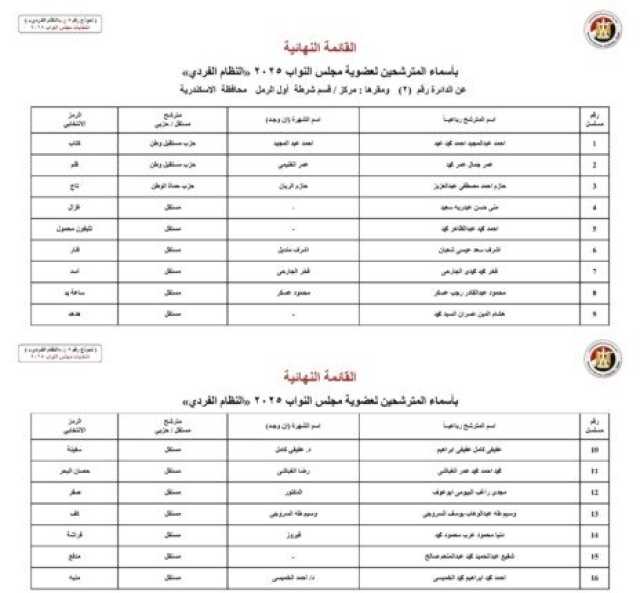 أعلنت الهيئة الوطنية للانتخابات، برئاسة القاضي حازم بدوي، قائمة أسماء المرشحين النهائية لانتخابات مجلس النواب 2025 في جميع المحافظات، عن النظام الفردي، موضحة رموزهم الانتخابية، و مستقل أم حزبي.
