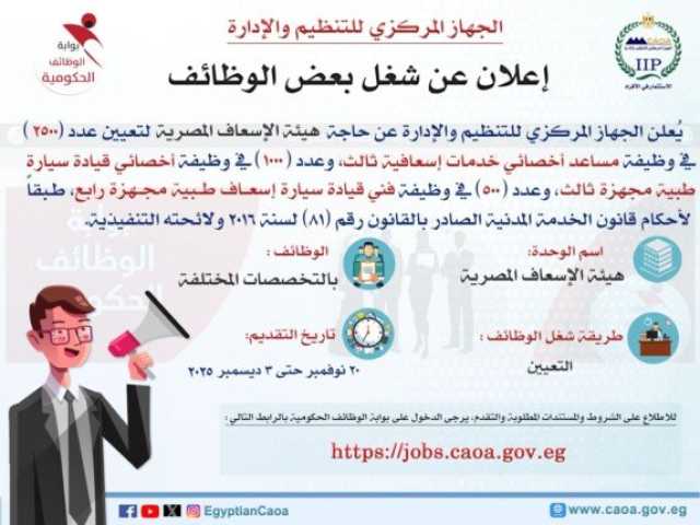 وأوضح الجهاز أنه سيتم فتح باب التقديم في وظائف هيئة الإسعاف المصرية اعتباراً من يوم 20 نوفمبر وحتى يوم 3 ديسمبر 2025، على أن يتم تقديم طلب التقدم على الوظائف المتاحة على موقع بوابة الوظائف الحكومية.