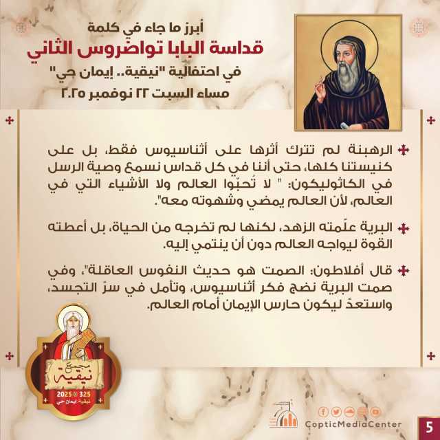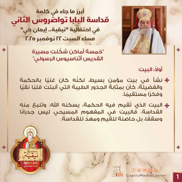 واختتم قداسته بالإشارة إلى جذور أثناسيوس التي تأسست في بيت بسيط عاش فيه الحكمة والفضيلة، فصار البيت حاضنة للقيم ومهدا للقداسة التي صنعت شخصية هذا القديس العظيم.