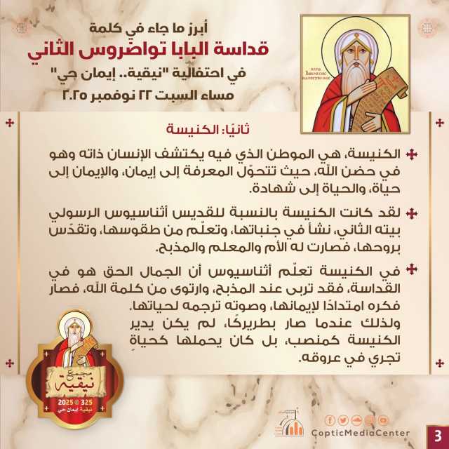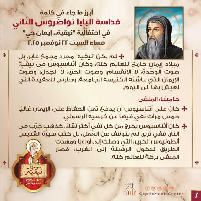 صوت الوحدة والحقوأوضح قداسة البابا أن مجمع نيقية لم يكن حدثا عابرا، بل ميلادا لإيمان جامع للعالم كله، وكان القديس أثناسيوس صوت الوحدة والحق، وحارسا للعقيدة التي ما زلنا نعيش بها حتى الآن.