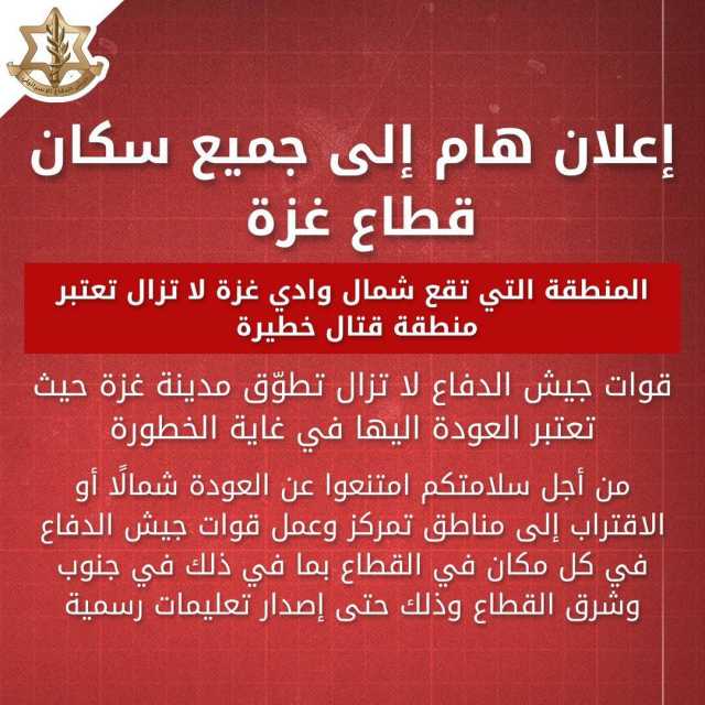 ففي بيان صدر صباح اليوم الخميس، أعلن الناطق باسم الجيش الإسرائيلي باللغة العربية أن منطقة في مدينة غزة ما زالت تعتبر "منطقة قتال خطيرة"، محذراً السكان من محاولة التحرك شمال جسر وادي غزة، المعروف باسم محور نيتساريم، مؤكداً أن المنطقة لا تزال تخضع لعمليات عسكرية وأن أي اقتراب منها يشكل "خطراً مباشراً على الحياة".