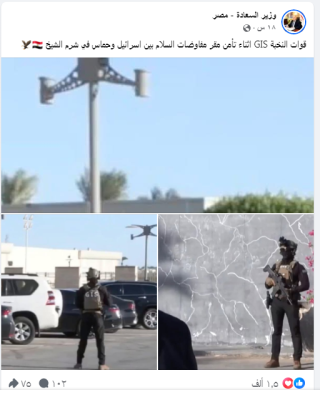 شهدت مواقع التواصل الاجتماعي موجة تفاعل واسعة عقب تداول صور ومقاطع فيديو لقوات النخبة بجهاز المخابرات العامة (GIS)، أثناء مشاركتها في تأمين مقر مفاوضات السلام الجارية بين إسرائيل وحركة حماس بمدينة شرم الشيخ.