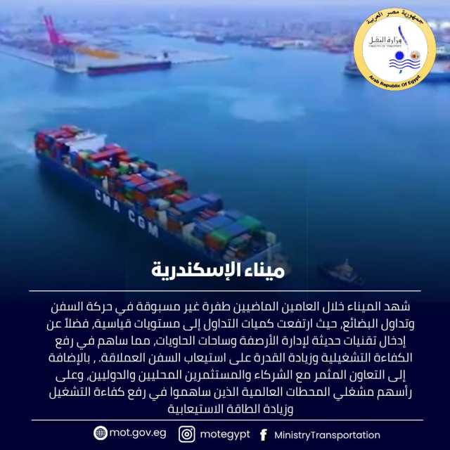 وشهد ميناء الإسكندرية خلال العامين الماضيين طفرة كبيرة في حركة السفن وتداول البضائع، مدعومًا بإدخال تقنيات حديثة لإدارة الأرصفة وساحات الحاويات، وبتعاون واسع مع الشركاء المحليين والدوليين، وعلى رأسهم مشغلو المحطات العالمية الذين أسهموا في رفع كفاءة التشغيل وزيادة الطاقة الاستيعابية. وتواصل وزارة النقل حاليًا تنفيذ مشروعات استراتيجية كبرى، أبرزها محطة “تحيا مصر 2 متعددة الأغراض” برصيف 100 في ميناء الدخيلة، ومشروع ميناء المكس، بما يعزز من تنافسية الميناء مستقبلاً ويضعه على طريق الريادة الإقليمية في مجال اللوجستيات والتجارة البحرية.