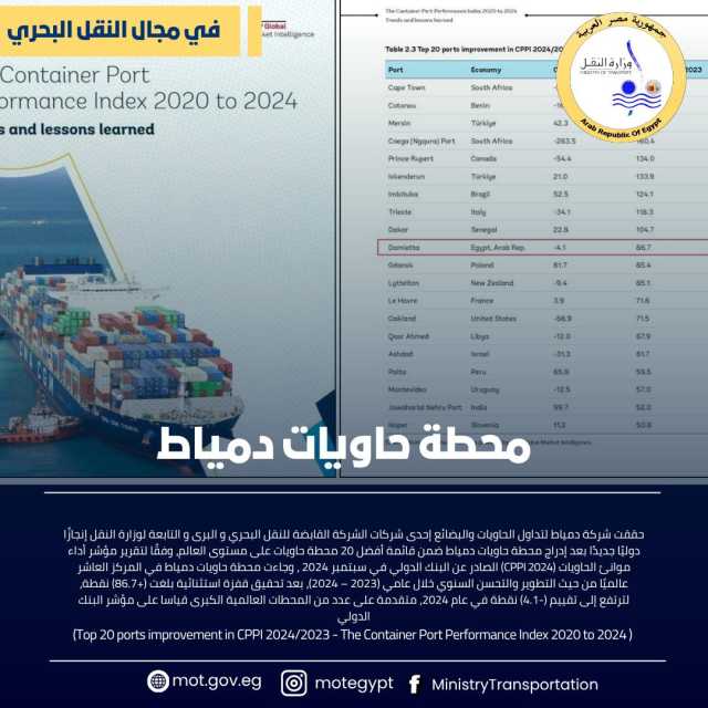 وفي السياق ذاته، دخلت محطة حاويات دمياط قائمة أفضل 100 محطة حاويات في العالم لعام 2023، كما احتلت المركز الأول عالميًا من حيث نسبة التغيير في الإنتاجية بنسبة 60.2% وفقًا لتصنيف Lloyd’s List الصادر في أغسطس/آب 2024. كما أدرجت محطة حاويات دمياط ضمن أفضل 20 محطة حاويات على مستوى العالم وفقًا لتقرير مؤشر أداء موانئ الحاويات (CPPI 2024) الصادر عن البنك الدولي، بعد تحقيقها قفزة استثنائية بلغت (+86.7) نقطة لتصل إلى تقييم (-4.1) نقطة في عام 2024، متقدمة على عدد من المحطات العالمية الكبرى.