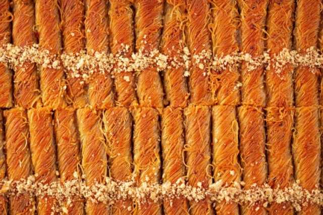 لفي الكنافة على شكل رول بإحكام، وضعيها في صينية مدهونة بالسمن.