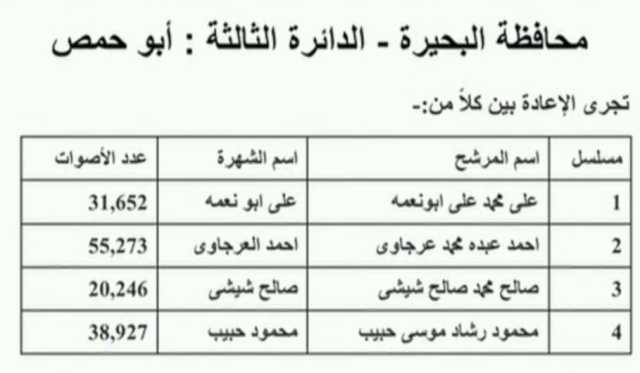 أعلن رئيس الهيئة الإعادة بين 6 مرشحين بالدائرة الأولى دمنهور بالبحيرة وهم : إعادة بين سناء أنور – طه زكريا – علاء محمد – محمود إبراهيم – رضا محمود – محمد عبدالوهاب.