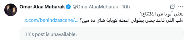 في الوقت نفسه، نفى عمر علاء مبارك حفيد حسني مبارك ونجل “علاء” حضور والده حفل الإفتتاح بتغريدة كوميدية استنكر من خلالها الخبر المتداول، حيث قال: “يعني أبويا في الافتتاح؟ … طب اللي قاعد جنبي بيقولي اعمله كوباية شاي ده مين؟”، وذلك عبر حسابه الشخصي بمنصة التغريدات المصغرة “إكس”.