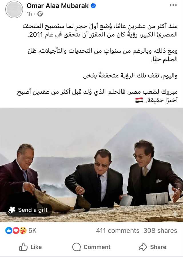 في الوقت نفسه، أعرب عمر علاء مبارك بفخره واعتزازه بانتمائه لمصر، مشيدًا بعظمة وجمال افتتاح المتحف المصري الكبير الذي وضع جده الرئيس الراحل حسني مبارك أول حجر أساس له منذ أكثر من 20 عامًا، حيث قال: "منذ أكثر من 20 عامًا، وُضِعَ أولُ حجرٍ لما سيُصبح المتحفَ المصريَّ الكبير، رؤيةٌ كان من المقرّر أن تتحقق في عام 2011".