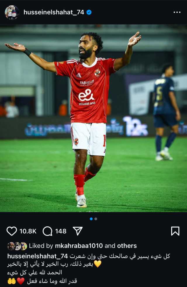 وكتب الشحات عبر حسابه الشخصي بموقع إنستجرام: "كل شيء يسير في صالحك حتى وإن شعرت بغير ذلك، رب الخير لا يأتي إلا بالخير، الحمدلله على كل شيء، قدر الله وما شاء فعل".