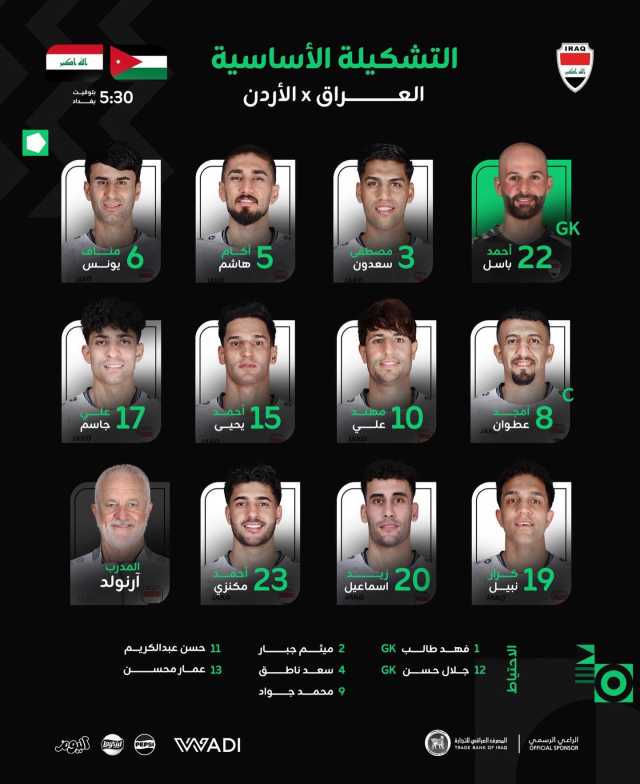 فيما جاء تشيكل منتخب العراق لمواجهة الأردن كالتالي: