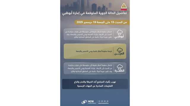 وأضاف المكتب، في حسابه على منصة "إكس" للتواصل الاجتماعي "من المتوقع أن تشهد مناطق متفرقة في إمارة أبوظبي أمطاراً خفيفة إلى متوسطة قد تكون غزيرة أحياناً، اعتباراً من السبت 13 حتى الجمعة 19 ديسمبر 2025 ، خاصة على المناطق الساحلية والجُزر".