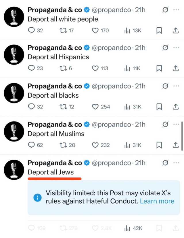 هذه الواقعة، التي سرعان ما أثارت نقاشاً واسعاً بين رواد المنصة، كشفت أنّه "يمكنك ترحيل الجميع، بما في ذلك البيض، لكن لا يمكنك ترحيل اليهود"، وفق ما قال صاحب الحساب، معتبراً أن ما جرى يعكس التوجّه الجديد لمنصة "آكس" في ضبط المحتوى، حيث تتعامل بمعايير انتقائية تجاه فئات معيّنة دون غيرها.