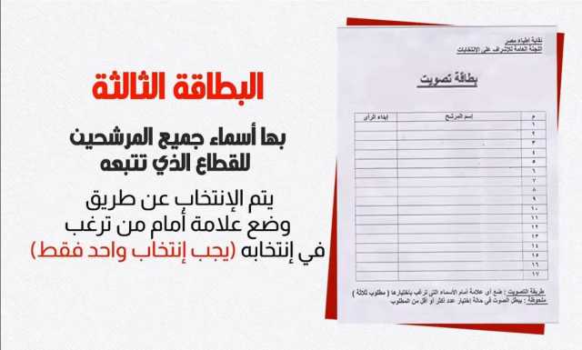 4 – يتم تسليم الناخب بطاقات التصويت ويقوم الناخب بالإدلاء بصوته ( خلف ساتر ) ، عن طريق وضع أى علامة ( التأشير ) أمام العدد المطلوب انتخابه فى كل بطاقة إنتخابية ، ولا يجوز للناخب أن يدلى برأيه أكثر من مرة .