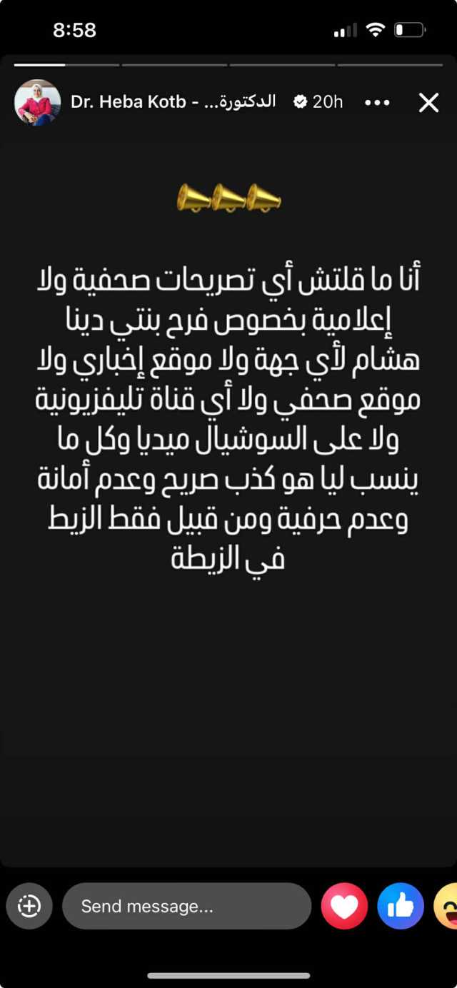 نفت الدكتورة هبة قطب ما تم تداوله على بعض المواقع الإخبارية ومنصات التواصل الاجتماعي بشأن تصريحات نسبت إليها حول حفل زفاف ابنتها دينا، مؤكدة أنها لم تُدلِ بأي تصريحات صحفية أو إعلامية سواء للمواقع أو القنوات أو عبر حساباتها على السوشيال ميديا.