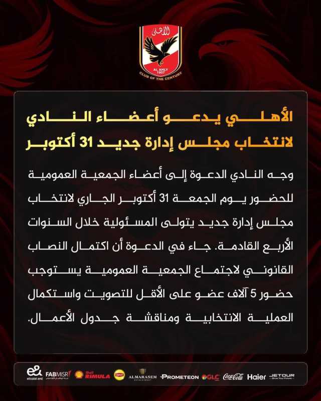 الأهلي يدعو أعضاء النادي لانتخاب مجلس إدارة جديد ..تفاصيل