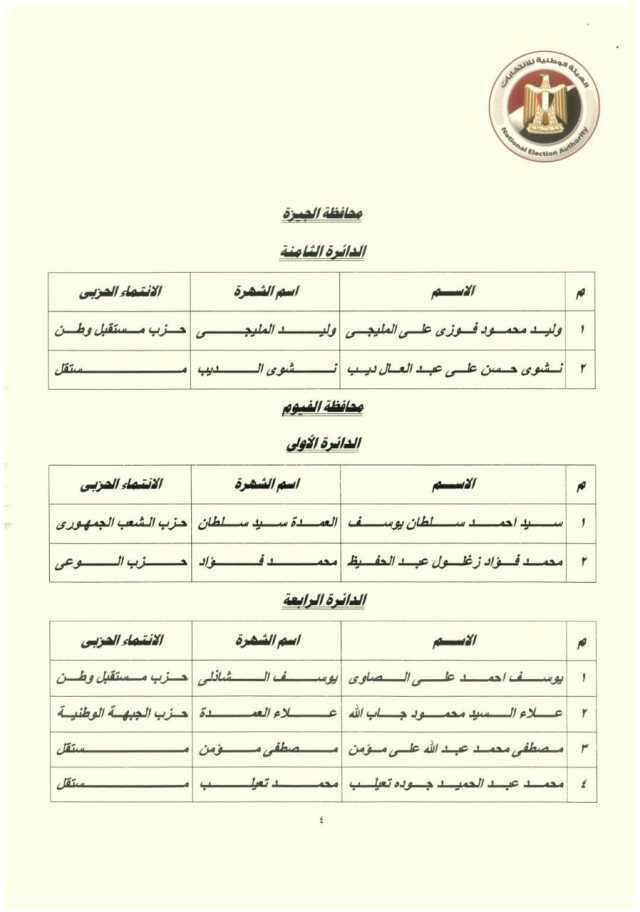 وأضاف أن المرشحان الفائزان بالدائرة الأولى بمحافظة الفيوم ومقرها مركز الفيوم، محمد محمود أحمد عبد القوي، علي أيوب محمد عبد المجيد عثمان صالح والإعادة بين المرشحين سيد أحمد سلطان يوسف ومحمد فؤاد زغلول عبد الحفيظ.